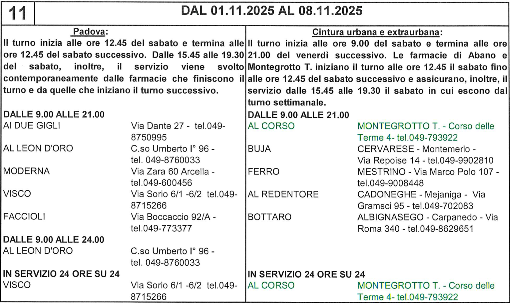Da sabato 01 novembre 2025 a sabato 08 novembre 2025